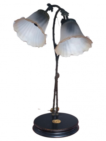 • ABAJUR, um (1) abajur para duas lâmpadas ao gosto Art Noveau, confeccionado em metal com patina escura, hastes curvas com fios torcidos com incrustação de folhagens, duas mangas em vidro satine com bordas curvas, apoiada sobre base oval em MDF, possivelmente levava uma escultura na parte central, medindo 61cm.