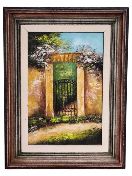 • ADÉLIA (?), "Portão", óleo sobre tela, moldura em madeira escura com paspatur claro, medindo 41x31cm e tela 29x19cm.