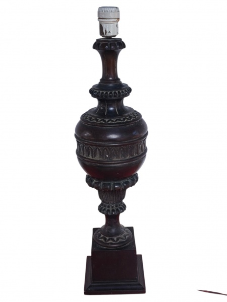 • ABAJUR, um (1) abajur para uma lâmpada confeccionado em madeira escura com corpo torneado em balaustre, ricamente entalhado por folhagens, frisos ondulados e caneluras em baixo relevo, apoiada sobre base quadrangular escalonada, medindo 57cm.
