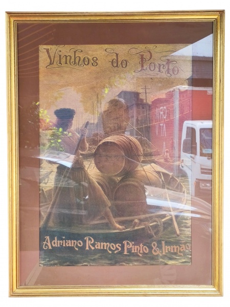 • QUADRO, uma (1) reprodução representando cena alusiva aos Vinhos do Porto, com inscrição Vinhos do Porto na parte superior e Adriano Ramos Pinto & Irmão na parte inferior. Peça sob vidro com moldura em madeira com patina dourada, medindo 87x66cm.
