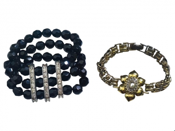 • BIJUTERIAS, duas (2) peças, sendo: A) 1 bracelete elásticode 3 voltas com contas em cristal facetado na tonalidade preta e barretes metálicas com incrustações de zircônia e B) 1 pulseira em metal dourado decorado por flor com incrustação de pedrarias sintéticas com falhas na douração, medindo 19cm de comprimento.