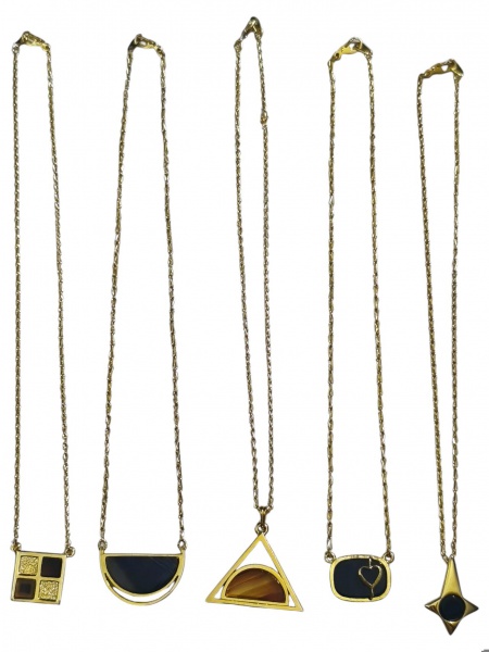 • BIJUTERIAS, cinco (5) cordões confeccionados em metal dourado com pingentes de modelos, tamanhos e decorações distintas, medindo 39cm de comprimento.