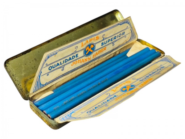 • COLECIONISMO, um (1) estojo metálico contendo lápis antigos, da marca Johann Faber, com rótulos internos originais ostentando os dizeres Lapis Superior e Qualidade Superior, em conjunto composto por 9 exemplares na cor azul.