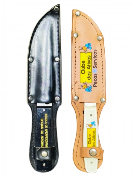 • CUTELARIAS, lote com duas (2) facas confeccionadas em aço inox, sendo: A) 1 com cabo na tonalidade preta da ESCOLA DE APERFEIÇOAMENTO DE OFICIAIS DA AERONAUTICA, bainha em couro na tonalidade preta, medindo 21,5cm com bainha e B) 1 com cabo na tonalidade branca do CLUBE DOS ATIVOS da VOLKSWAGEM, bainha em couro na tonalidade marrom, medindo 21cm.