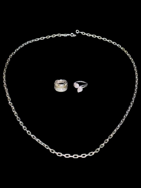• JOIAS, lote com três (3) peças confeccionadas em PRATA DE LEI, sendo: A) 1 cordão com elos cartier, sem fecho e alguns elos com sinais de solda, medindo 72,5cm de comprimento, B) 1 anel com filete em ouro e incrustação de pedrarias, apresentando ausência de algumas, aro 17 e B) 1 anel contrastado 925 decorado por folhagens incrustado por pedrarias translucidas, aro 17, peso total bruto 36,7g.