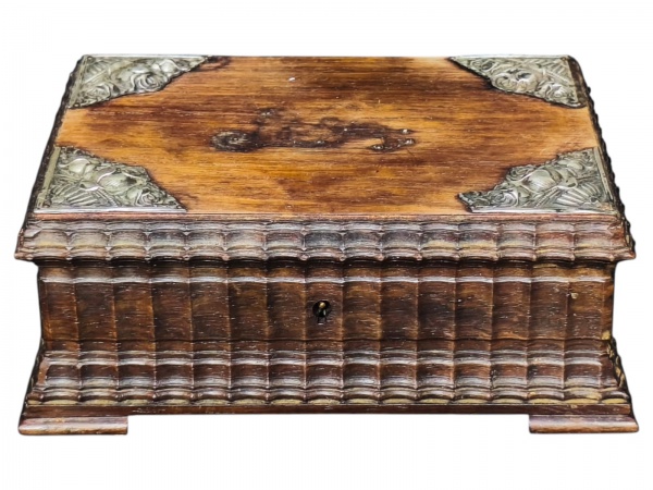 • DIVERSOS, uma (1) caixa porta joias confeccionada em madeira com entalhes frisados e apliques florais em PRATA DE LEI, interior revestido em veludo vermelho, ausência da placa central, não acompanha chave, medindo 7,5x18x13cm.