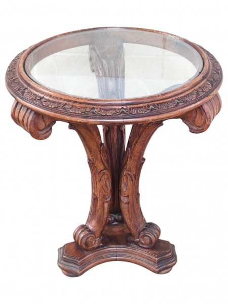 • MOBILIARIO, uma (1) mesa lateral confeccionada em madeira entalhada a mão, tampo circular em vidro com guarnição entalhada em folhagens, sustentado por três hastes finalizadas em volutas, apoiadas sobre base tripoide recortada, medindo 60x53cm, pequeno bicado na borda do vidro.