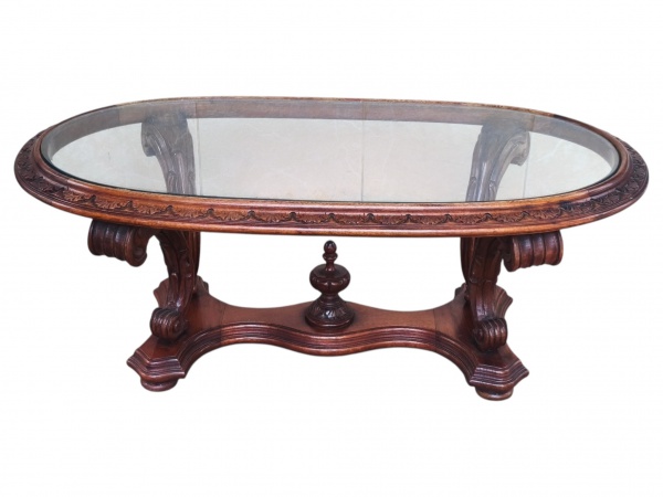 • MOBILIARIO, uma (1) mesa de centro confeccionada em madeira entalhada a mão, tampo oval em vidro com guarnição entalhada em folhagens, sustentado por quatro pés finalizados em volutas, apoiadas sobre base recortada com bilro na parte central, medindo 44x119x63cm.