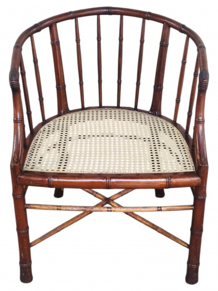• MOBILIARIO, uma (1) cadeira estilo Regency inglesa com estrutura em madeira imitando bambu com amarração central em X e assento em palinha sintética, medindo 75x60x52cm