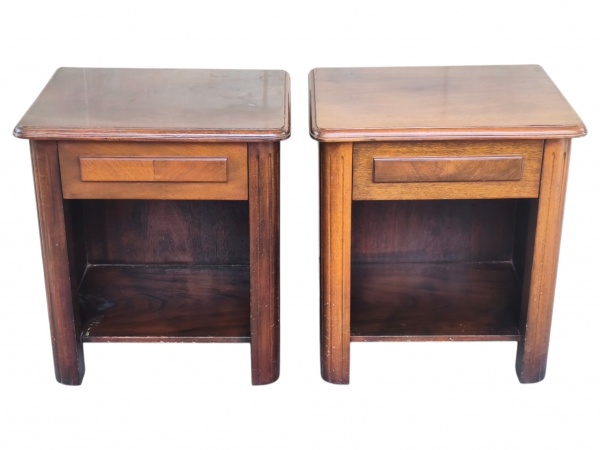 • MOBILIARIO, par (2) de mesas cabeceira confeccionada em madeira laminada, 1 gaveta e estágio inferior, apresentam desgastes na madeira, medindo 55,5x40x50cm.
