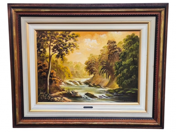 • FIORAVANTE, JOSÉ RAUL (Jundiaí, 1/3/1958), "Paisagem", óleo sobre tela, datado de 1996 moldura em madeira, medindo 86x106cm e tela 50x70cm.