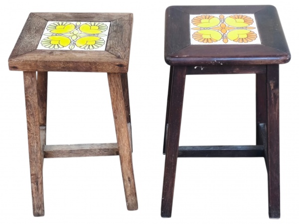 • MOBILIARIO, dois (2) bancos com estruturas confeccionadas em madeira, sendo 1 escura e 1 clara (no estado) com incrustação de azulejo floral no assento, ambos possuem rachadura no azulejo, clara com sinais de cola, medindo 43x26x26cm e 46x27x27cm.