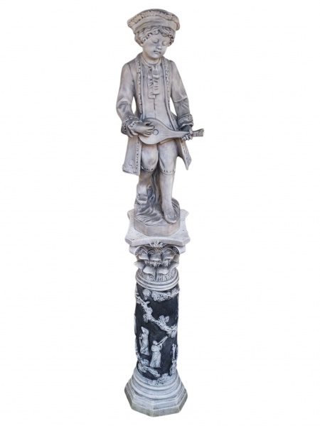 • ESCULTURA, uma (1) escultura acompanhada com coluna confeccionada em estuque patinado na tonalidade cinza representando musicista, apoiado sobre coluna cilíndrica com recortes no tampo e na base, decorado por guirlanda de folhagens e cenas com figuras com fundo preto, apresentando imperceptível bicado na base, vide foto, escultura medindo 58,5cm e coluna 65cm.