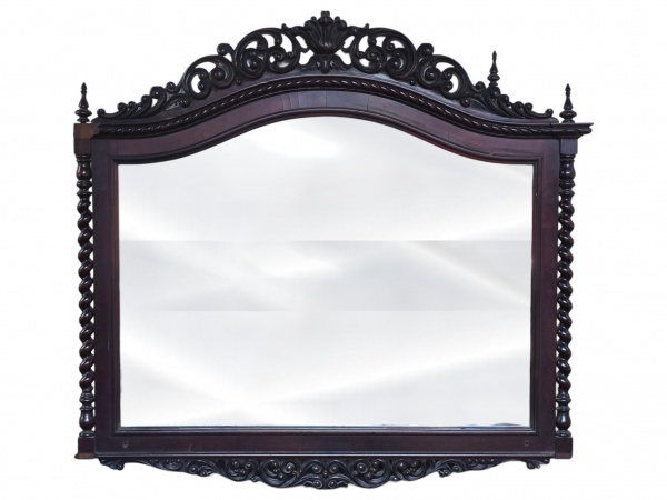 • ESPELHO, um (1) espelho de parede bisotado com moldura confeccionada em madeira escura, ricamente trabalhada, apresentando frontão recortado com volutas vazadas, pináculos laterais, colunas torsas e acabamento entalhado também na parte inferior, apresentando ausência de bilros na parte superior, pequenas quebras e falta de arremates laterais, vide foto, medindo 116x122cm.