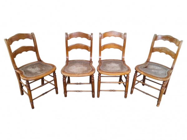 • MOBILIARIO, quatro (4) cadeiras, confeccionadas em madeira clara com encosto vazado em recortes, assentos em palinha, apoiado sobre pés torneados com amarração lateral, vendidas no estado, vide foto, apresentando desgastes na palinha de 2 cadeiras, 1 com amarração lateral quebrada e algumas com pequenas falhas na madeira, medindo 82x44x41cm.