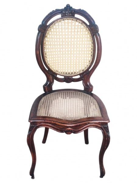 • MOBILIARIO, uma (1) cadeira medalhão, confeccionada em madeira escura, com encosto oval e assento em palhinha sintética, espaldar com vazados, saia recortada e pernas curvas de desenho elegante e inspiração clássica, medindo 104x49,5x49cm.