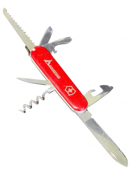 • CUTELARIA, um (1) canivete Suíço, multifuncional, confeccionado em aço inox e outros materiais, manufatura VICTORIA, também conhecida como VICTORINOX, linha Camping (com tradição desde 1884, fornecedora de facas para o Exército Suíço desde 1897), medindo aberto  23cm de comprimento, leves sinais de uso, vide foto. Leves sinais de oxidação.