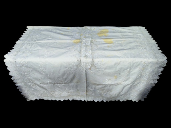 • CAMA, MESA & BANHO, uma (1) toalha de mesa retangular, confeccionada em tecido branco, com bordado vazado em motivos florais e folhagens, barra recortada, apresenta manchas, vide foto, medindo 280x162cm.