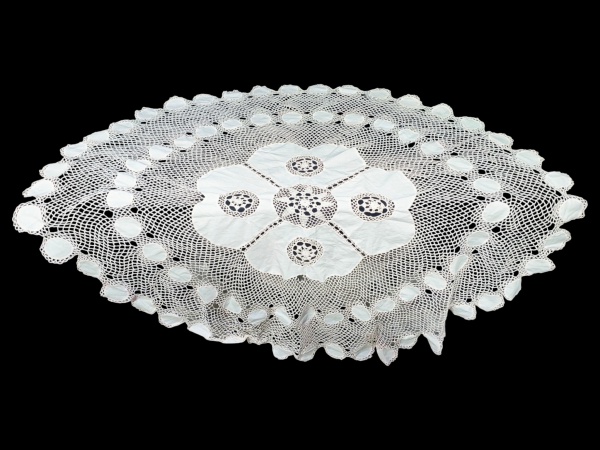 • CAMA, MESA & BANHO, uma (1) toalha de mesa redonda, em crochê rosado e tecido branco, apresentando decoração central floral estilizada e borda recortada com aplicações em forma de pétalas ou folhas em vazados, medindo 160cm.