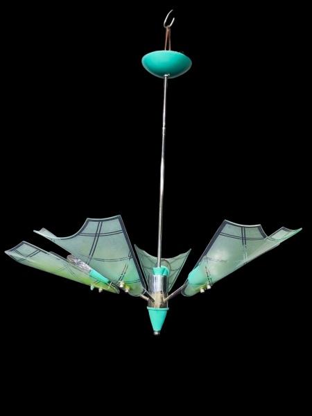 • LUSTRE, um (1) lustre de teto anos para cinco lâmpadas, anos 60, estrutura metálica cromada e elementos em vidro artisticamente moldado em tom esverdeado, com decoração geométrica, arremates esmaltados na tonalidade verde, leves sinais de oxidação no cromo, porém, em excelente estado de conservação, medindo 68x68cm.