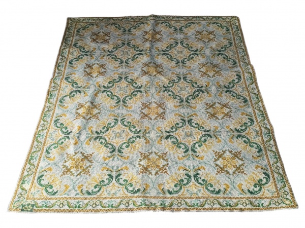 • TAPETE, um (1) tapete Casa Caiada, datado de 1985, necessita limpeza e reparo na borda, pano traseiro solto, medindo 184,5x143,5cm.