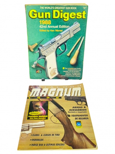 • LIVROS, duas (2) publicações sobre armas e tiro, sendo: um (1) exemplar gun digest 1988  42nd annual edition, editado por ken warner, publicação em idioma inglês, com capa ilustrada; e um (1) exemplar catálogo magnum 1995, publicação em idioma português, voltada a armas, acessórios e equipamentos de recarga, com capa ilustrada. no estado, com sinais de manuseio, marcas do tempo, desgastes nas capas e bordas, conforme imagens.