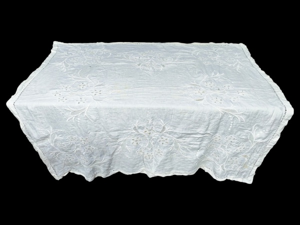 • CAMA, MESA & BANHO, uma (1) toalha de mesa quadrada, em tecido branco, ricamente trabalhada com bordados Richelieu, com trechos de crivo ou rede nos vazados e decoração floral, apresentando barra com acabamento recortado, manchas e furos, no estado, medindo 132x132cm.