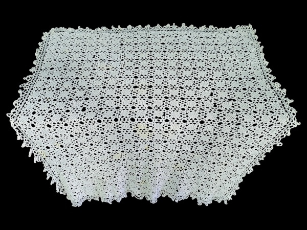 • CAMA, MESA & BANHO, uma (1) toalha de mesa retangular, em crochê branco, apresentando elaboração rendada em desenho geométrico repetitivo e barra com acabamento recortado, apresenta furo e manchas de guardado, medindo 135x110cm.