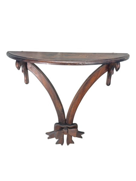 • MOBILIARIO, um (1) console de parede confeccionado em madeira escura, tampo meia lua, laterais recortadas, hastes curvas finalizada em laçarote, medindo 66x67,5x20cm.