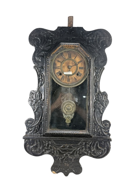 • RELÓGIO, um (1) relógio de parede ANSONIA (tradicional fabricante norte-americana de relógios, fundada no século XIX, reconhecida por seus relógios de parede, mesa e ornamento), com caixa em madeira entalhada e patinada em tom escuro, mostrador circular em papel com marcas do tempo e algarismos romanos, dois furos para dar corda, porta frontal envidraçada e pêndulo aparente. Peça apresentando marcas do tempo e ausência do adorno superior, falhas na patina e ausência do da chave, não testado e sem garantia de funcionamento, medindo 63x34,5cm.