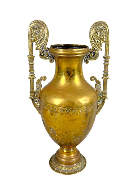 • BRONZE, uma (1) ânfora confeccionada em bronze, corpo cinzelado por folhagens e elementos circulares, laças no feitio de arabescos recortados com elementos florais e base circular escalonada, apresenta mossas, vide foto, medindo 33,5x17x9cm.