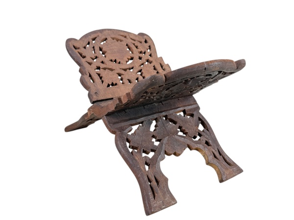 • ARTE SACRA, um (1) porta bíblia confeccionado em madeira escura, com entalhes florais e vegetalistas em vazados com recortes na borda, medindo 22x32x20cm.