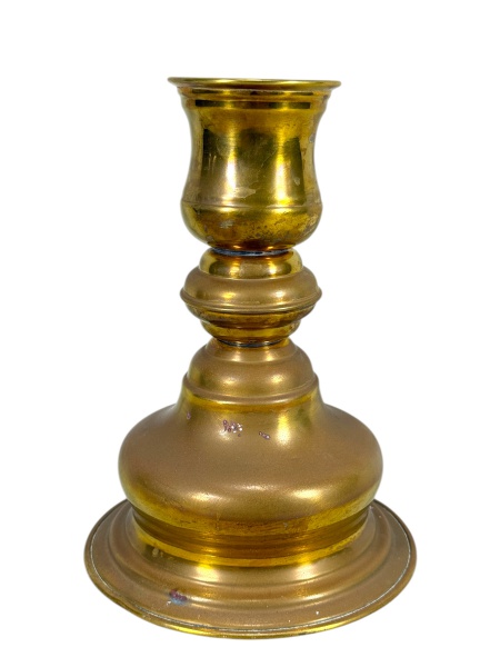 • METAL DOURADO, um (1) castiçal confeccionado em metal dourado, corpo torneado, apoiado sobre base circular escalonada, medindo 20cm de altura.