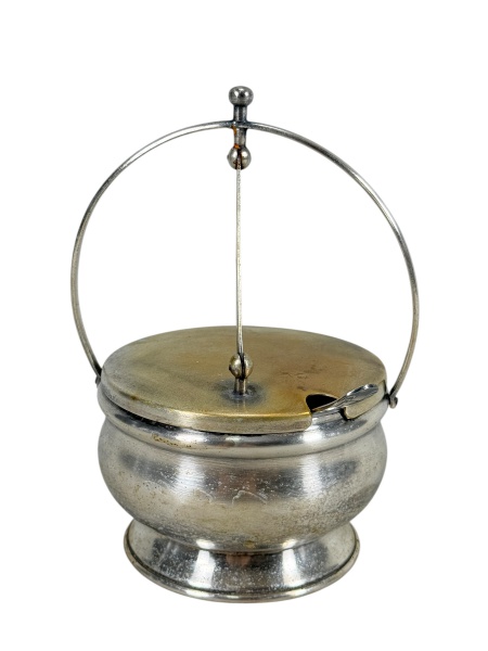 • METAL PRATEADO, uma (1) queijeira confeccionada em metal espessurado a prata da manufatura BEL PRATA, alça central articulada, recipiente interno em plástico rígido na tonalidade branca, acompanha colher adaptada, falhas no banho, medindo 15,5x9,5cm.