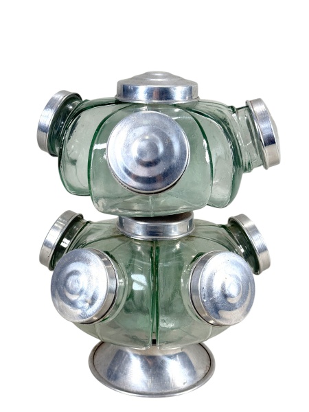 • VIDRO, um (1) baleiro de nove gomos confeccionado em vidro translucido, tampa e guarnições em alumínio, ausência de 1 gomo na parte superior, medindo 30x22cm.