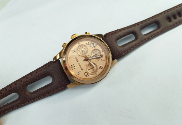 • Fashion Coleção, Relógio Cronógrafo Retrô Michael Kors 6 Ponteiros, Dourado, medindo 38mm de diâmetro. Quartz. Vidro Cristal. Calendário. Fundo em Aço de Rosca. Funcionando. Pulseira Esportiva em Couro marrom vazada nova.