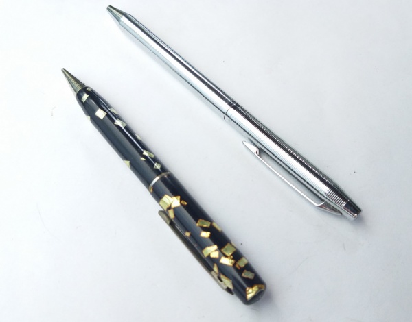 • Vintage Coleção, Decoração, Lote contendo Lapiseira e Esferográfica, sendo Lapiseira Rajada, modelo de girar o corpo segurando o bico para acionar o grafite, escrita grossa. Medindo 12cm + esferográfica Chromatic, modelo de dar meio giro na tampa para acionar a escrita. Carga ressecada. Precisa de refil novo. Medindo 14cm.