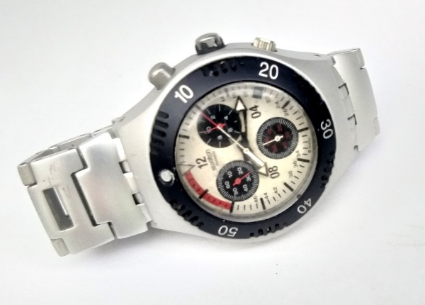 • Vintage Coleção, Decoração, Esportivo Relógio Swatch Swiss Made, Cronógrafo Irony Aluminium, de 2000, Quartz, Vidro Cristal, medindo 46mm de diâmetro. 6 Ponteiros, Calendário, Pulseira Original com regulagem para pulsos de 17cm e possui mais 2 furos para aumentar essa medida. Relógio parado, sem testar. Precisa colocar revisão em dia.