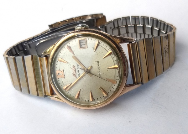 • Vintage Coleção, Decoração, Relógio Social Mido Multifort Powerwind Dourado, Automático, medindo 31mm de diâmetro, Segundeiro Central, Calendário, Cifras Douradas polidas em relevo, Fundo em Aço de Rosca, máquina original parada, muito tempo guardado. Precisa colocar revisão em dia. Pulseira comum dourada antiga de época, com regulagem para pulsos de 17cm e possui mais 4 furos para aumentar essa medida