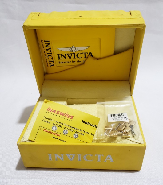 • Interessante Estojo de Relógio Invicta Original, completo com Manual, folheto, Certificado em inglês + 5 elos de pulseira dourada de 23mm de largura.