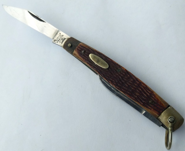 • Vintage Coleção, Decoração, Canivete SHELL Japan, modelo Clássico, Aço Inox com Cabo de Chifre medindo 14,6cm. Acabamento em metal amarelo, técnica de cravação em metal. Faltando um acabamento do lado esquerdo. Possui 8,6cm fechado.