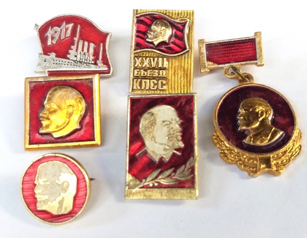 • Vintage Coleção, Decoração, Lote contendo 6 Pins Soviéticos de Lênin, em alumínio, esmaltado e folheado a ouro. Comemorativos do Navio Cruzador Aurora famoso papel na revolução Outubro de 1917; 27 Congresso Soviético que foi o Último Congresso antes da Perestróica, todos originais de época