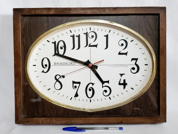 • Vintage Coleção, Decoração, Relógio BRASEIKO em madeira, com vidro, segundeiro central. Utiliza 1 pilha média não inclusa. Adesivo intacto de fábrica. Sem testar, pois está faltando a molinha do negativo no compartimento da pilha. medindo 37,5 x 28,5cm
