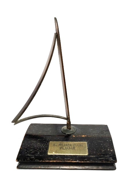 • Vintage Náutica, Coleção, Decoração, Troféu Escultura de Veleiro Estilizado, mastro articulável, giratório, em bronze, premiando 1º Lugar na XII Regata do CIAGA, medindo 23,5cm e com a base em jacarandá medindo 16 x 9cm.