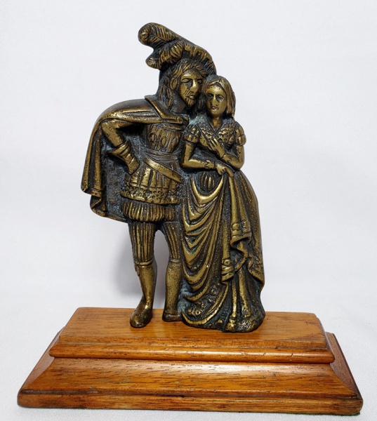 • Vintage Coleção, Decoração, Escultura de Casal de Fidalgos, Representando Romeu e Julieta, em bronze/metal, riqueza de detalhes, em base de madeira medindo 19 x 7,5cm e com 21,5cm altura.