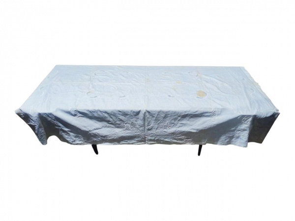 • CAMA, MESA & BANHO, uma (1) toalha de mesa retangular confeccionada em tecido na tonalidade branca, com bordados vazados e ornatos floralizantes distribuídos no campo central, cantos e abas, apresentando manchas de guardado, medindo 224x165cm.