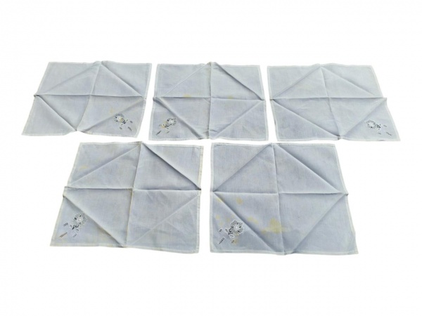 • CAMA, MESA & BANHO, cinco (5) guardanapos confeccionados em tecido na tonalidade branca, decorados com bordado vazado floral em uma das extremidades, apresentam manchas de guardado, medindo 34x38,5cm.