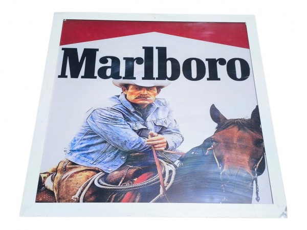 • QUADRO, um (1) quadro / pôster publicitário da marca Marlboro, com representação de cavaleiro montado a cavalo e logotipo em destaque, moldura em metal com pintura branca, apresenta mossas, vide foto, medindo 62x62cm.