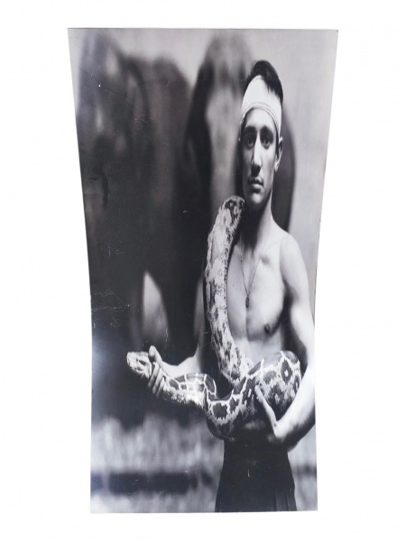 • QUADRO, uma (1) placa retangular, confeccionada em material plástico, retrata o momento em que Émilien Bouglione, um famoso domador de animais do Cirque d'Hiver em Paris, foi fotografado com uma jiboia, medindo 148x74cm. Ranhuras.
