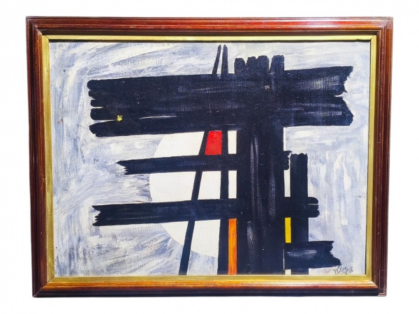 • WELLES (?), "Arte Abstrata', OSE., moldura em madeira escura, datado de 1969, medindo 68,5x86,5cm e obra 56,5x75,5cm.